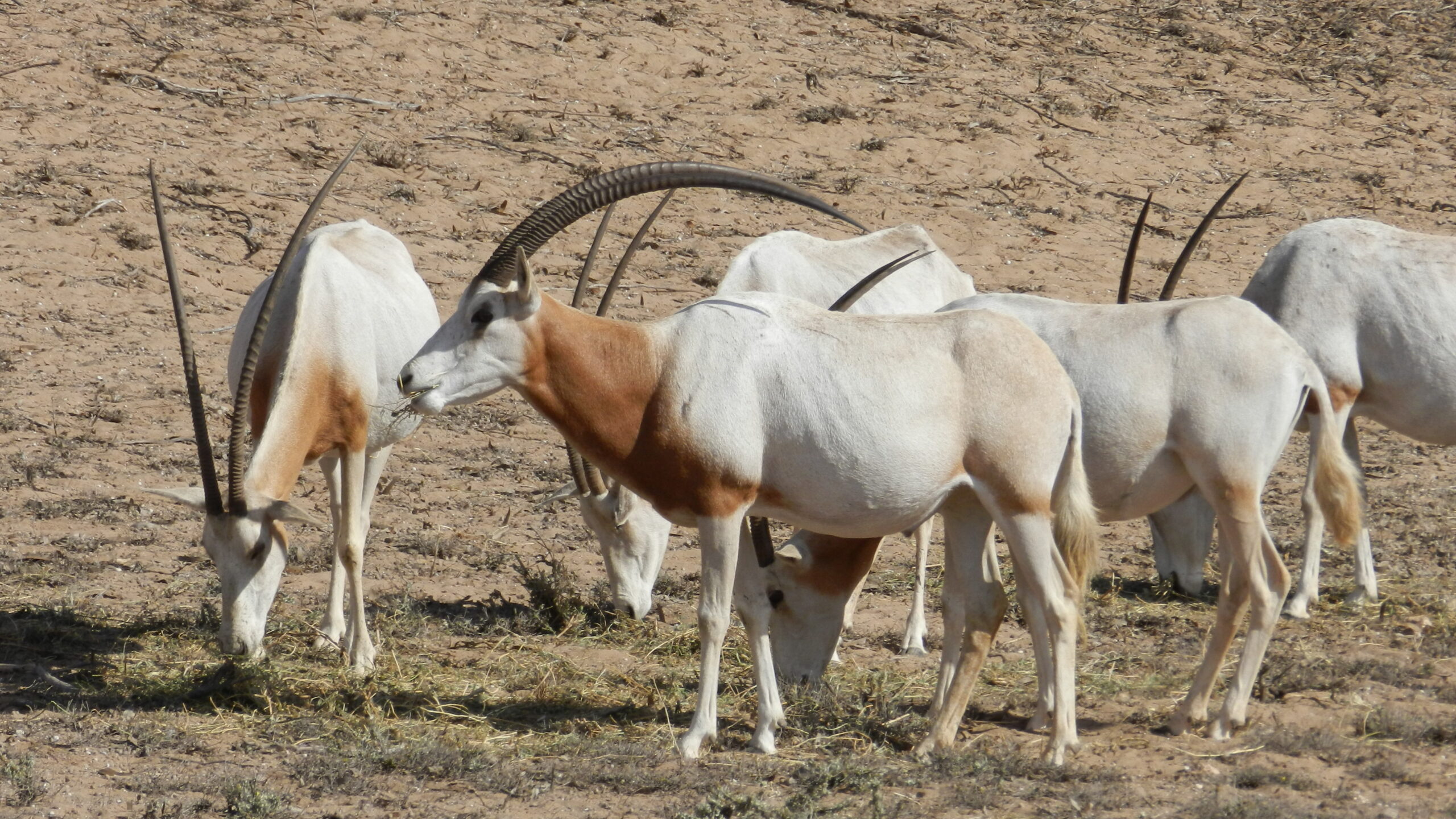The Oryx is the largest antelope found in the semi-desert regions of the Sahara. Its impressive horns can grow over 1 meter long. The species is now only found sporadically throughout its native range, with viable populations mostly limited to Chad. It disappeared from Morocco in 1973 and is currently listed as "critically endangered."
