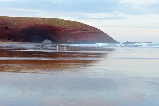 Legzira Beach, located 150 km south of Agadir and 10 km north of Sidi Ifni, is a surfer’s paradise and a hiker’s dream. Its red-hued cliffs, shaped by the ocean over centuries, form natural arches that create a stunning backdrop. The geological meeting of the Anti-Atlas Mountains and the Atlantic Ocean has crafted a masterpiece of nature that is truly awe-inspiring.