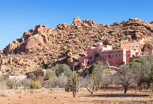 After crossing the spectacular mountain landscapes of the Anti-Atlas, you'll arrive in the charming town of Tafraout, nestled in a picturesque valley surrounded by bizarre and fascinating pink granite formations. These rounded, sculpted rocks, balanced at the foot and atop the mountains, seem almost otherworldly — shaped over centuries by wind and erosion.